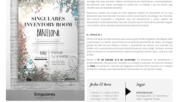 Ya sabéis que somos totalmente fans de los chicos de Singulares Magazine, compañeros de profesión y bloggers que han querido ir más allá haciendo este evento donde profesionales de la decoración, artesanos y emprendedores se darán cita en el espacio Ailaic (Passatge Utset, 14) durante los días 31, 1 y 2 de noviembre.