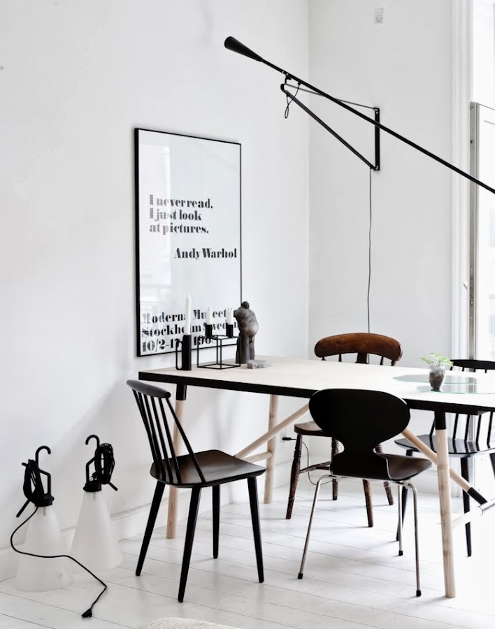 Holaaaaaa muy buenos días mis querid@s lectores, el dilema que hoy os propongo es de esos que siempre me atormentan ¡¡jajajaja!! que melodramático ha quedado, bueno ya me entendeís...que si los ambientes donde predomina el blanco transmiten calma, relax y buen rollo...que el uso del negro a veces resulta pelín "siniestro"... en fín que podríamos hacer un libro acerca de los defensores y los detractores de estos dos NO COLORES...pero hace unos días me quedé gratamente sorprendida al ver el trabajo de la interiorista sueca, Annaleena Leino, y después de darle muchas vueltas al tema, por fin he resuelto mi dilema...