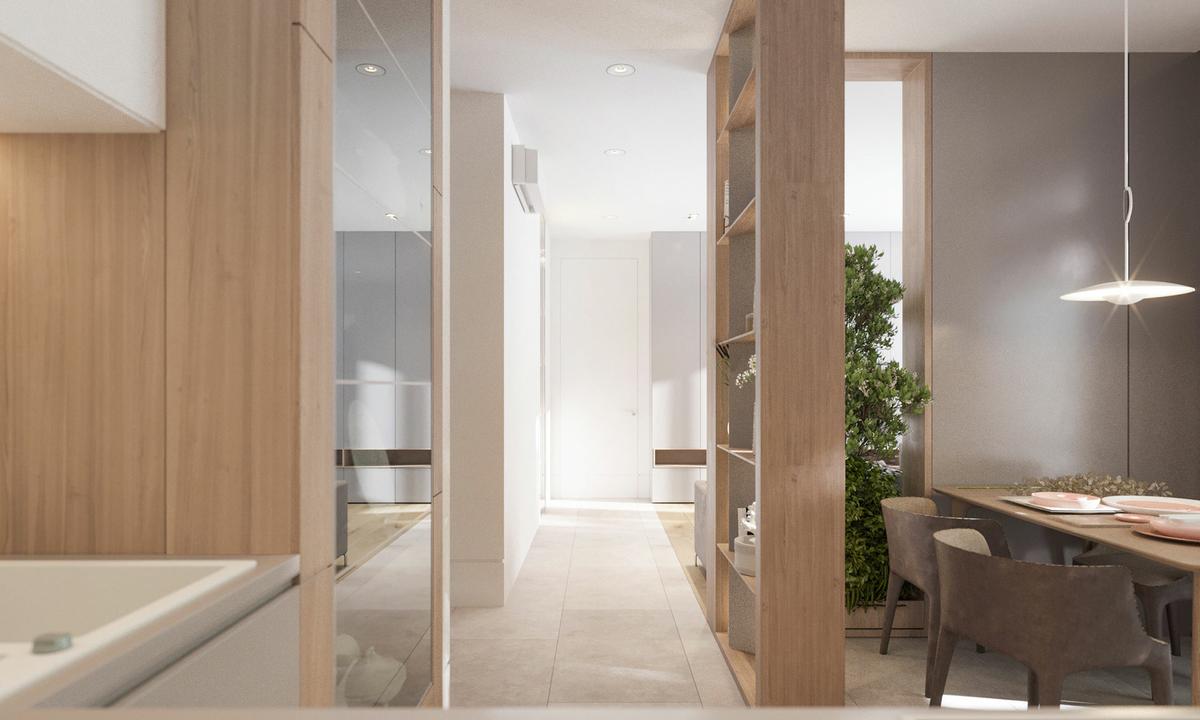A pesar de los pocos metros cuadrados con los que se contaba, el resultado es brillante. Un vestíbulo bastante espacioso en la entrada, decorado con paneles de chapa de madera de roble da paso a la cocina y al salón. Estas dos estancias comparten espacio a petición de los clientes, a través de una pared decorativa y con verde para darle frescor. Su “translucidez” crea una sensación de libertad e integridad. El sofá de la zona de estar se ha elegido de líneas sencillas, en un suave color café con leche. En la base se diseñan dos alfombra circulares, un sillón de diseño, y un par de mesas auxiliares de café. Lo más destacado de la estancia fue la interesante pared de televisión, que resultó ser minimalista pero funcional. Un ‘nicho’ para vajillas, marcos de fotos y recuerdos, hace las veces de separador. El mismo módulo exacto se duplicó en una pared adyacente. Ambos fueron complementados con cristales tintados e iluminación interna, por lo que por la noche pueden crear un interior acogedor en el salón.