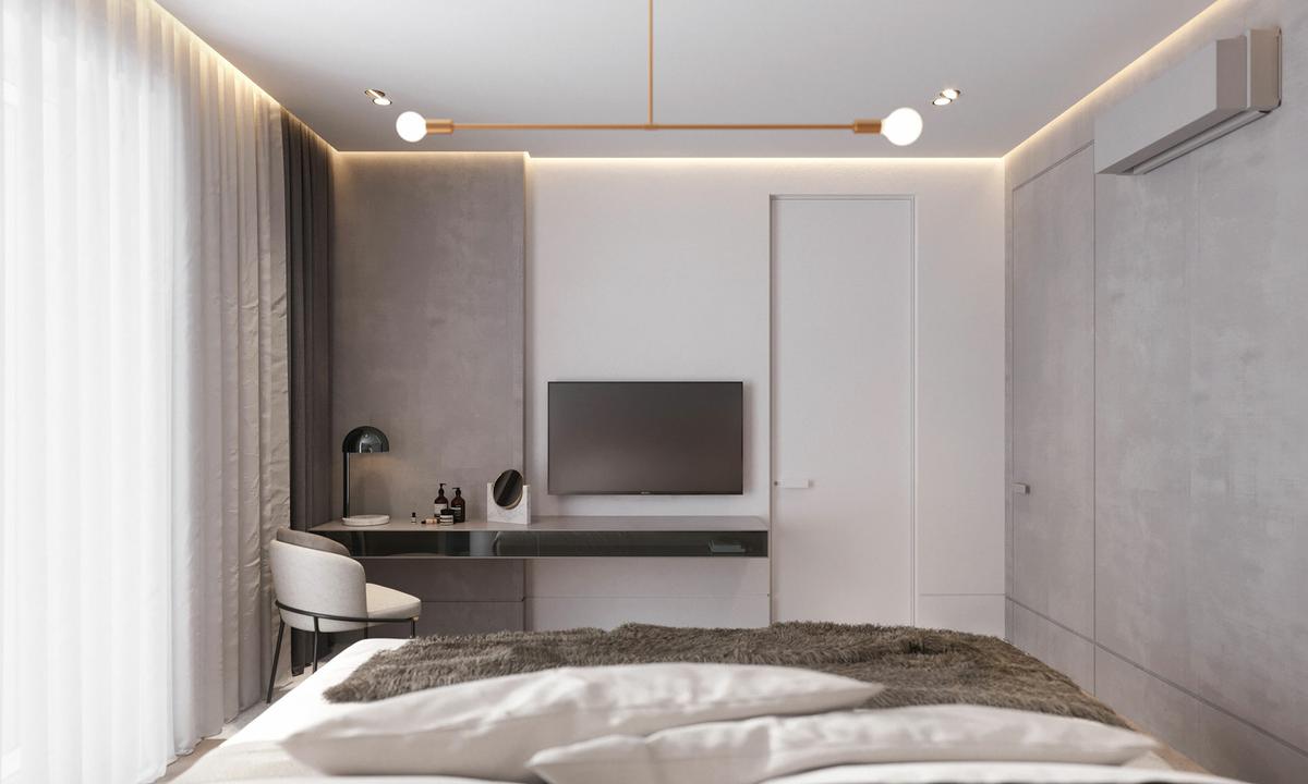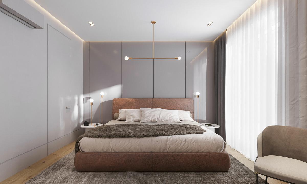 Dado que el dormitorio es un lugar para descansar, se buscó que pareciera tranquilo, diluyendo el contraste de colores con cortinas marrones, un agradable toque de textiles e iluminación. Se distribuyó un baño contiguo al dormitorio con ducha y un vestidor independiente, en el que se pueden guardar cosas de todos los días. Además de la cama, en el dormitorio hay una mesa de consola, perfecta para minutos antes de acostarse.