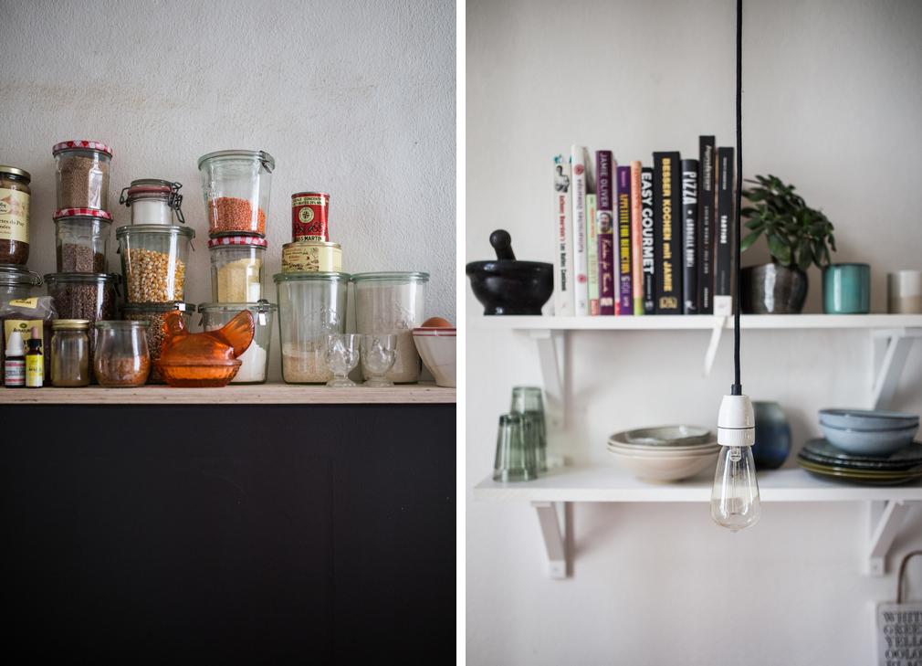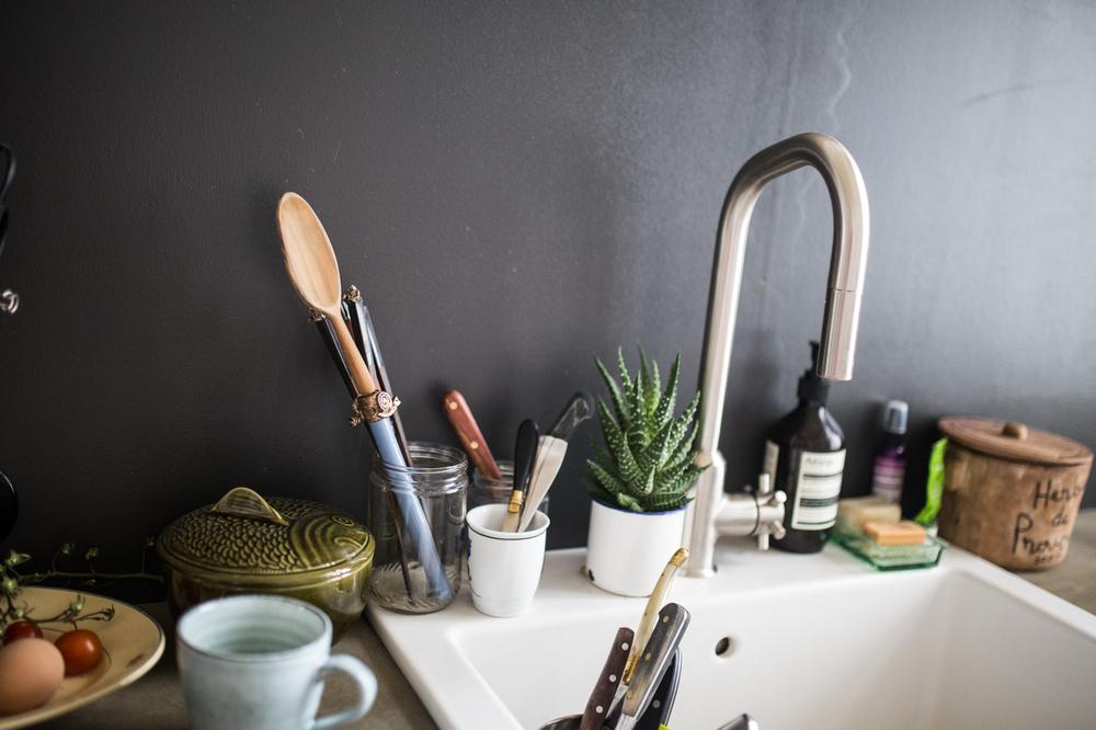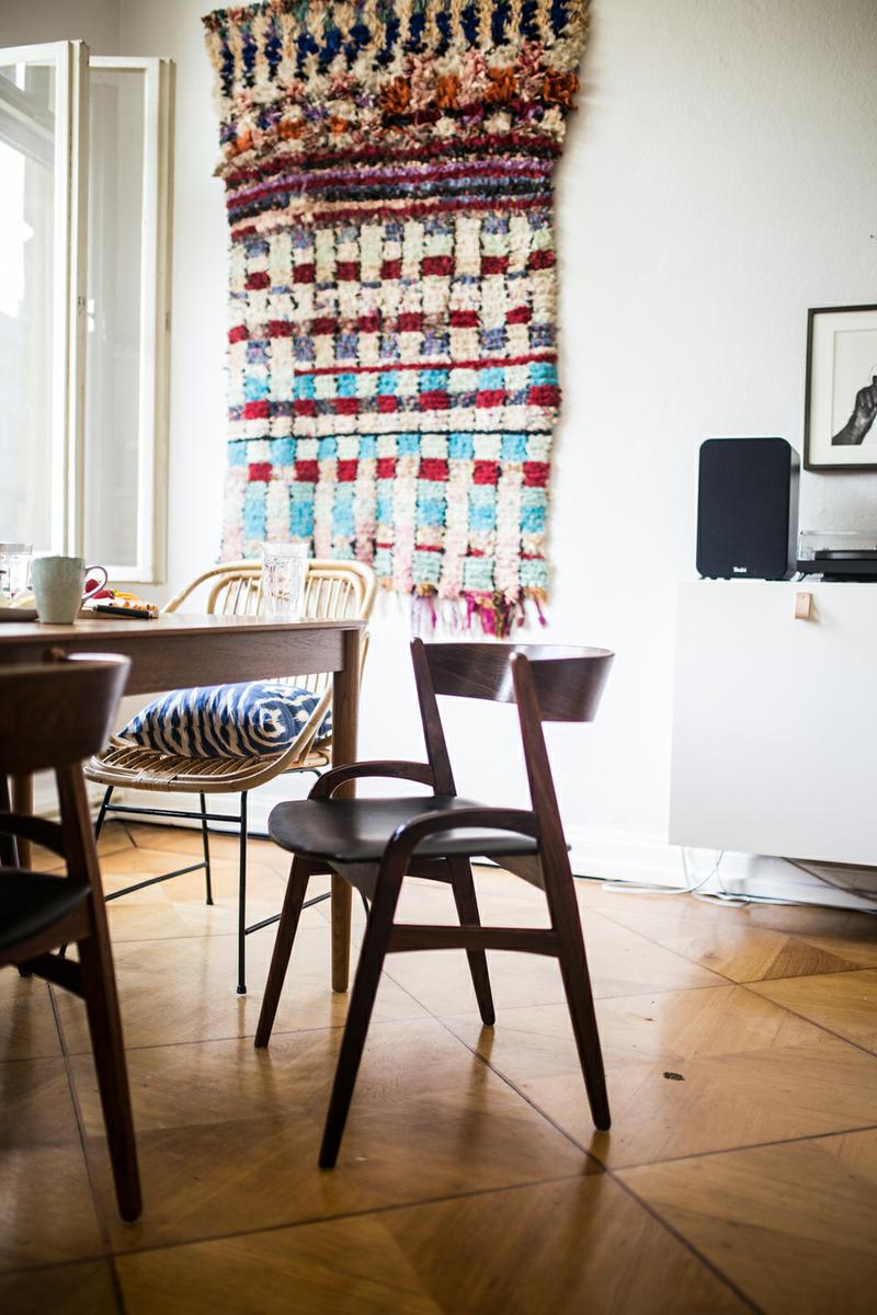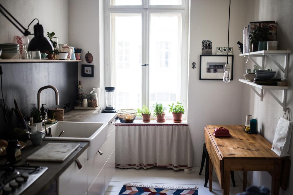 Sobre el hogar que te mostramos: esta casa con un toque boho nos ha gustado por su naturalidad, es preciosa. Todo guarda un orden pero con cierta holgura, sin ser demasiado estrictos. Los libros se apilan sobre las estanterias, junto con los recuerdos. En la cocina se ven los utensilios del día a día. Hay cables a la vista o arrugas en los textiles y en su desorden ordenado es perfecta.