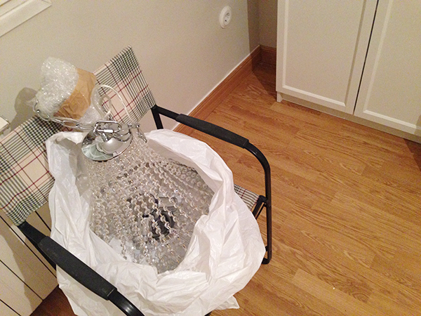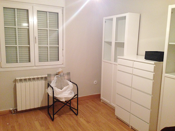 En la siguiente visita, cuando fuimos a instalar las cortinas, la lámpara ya estaba puesta, en un rincón esperaba la alfombra y la lámpara de mesa a falta del escritorio.