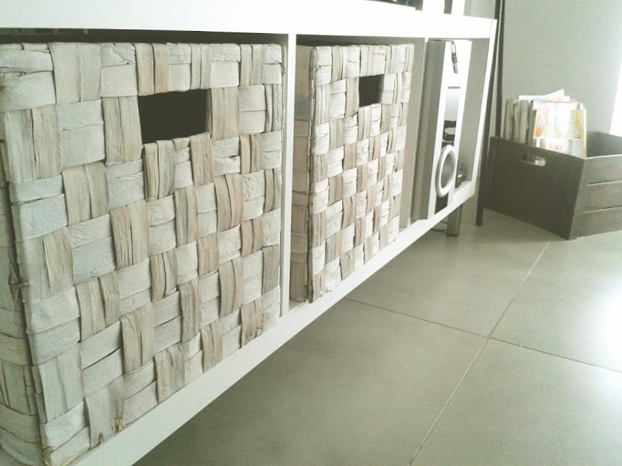 Y par terminar las nuevas cestas del mueble tv, son de Leroy Merlin, me enamoraron nada mas verlas por su color, un blanco envejecido que deja salir pequeñas pinceladas del color original de las fibras naturales, lo mejor es el espacio de almacenamiento que hemos ganado y por su tamaño no deja nada a la vista