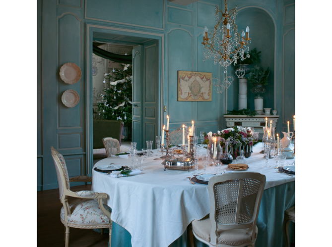 Matices de color y efectos de los materiales en las carpinterías del siglo XVIII, pintados en tonos de azul agua cubierto con un blanco 'alterado', que ofrecen un escenario ideal para la gran mesa ovalada rodeada de sillas de caña de Luis XV y Luis XVI convertibles. En este espacio la fiesta nunca se detiene y se desarrollan sorpresas. Una gran mesa adornada con un mantel de raso coordinado en tonos aqua azul de la madera que espera a los huéspedes en un ambiente suntuoso donde se mezcla con plata y porcelana de cristal veneciano Parisino.