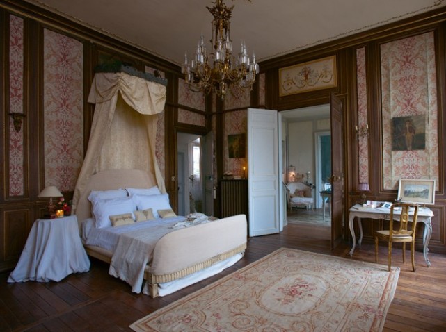 En el interior, las habitaciones amplias propician la circulación y las perspectivas, los volúmenes generosos. Con su dosel, el salón de la ex marquesa de Beauharnais, se transformó en una habitación tipo suite preciosa. Tonos estilo Laura Ashley con papel pintado y revestimientos a juego de imitación madera pintada en oro nos ambienta en los sueños de un espacio suave y romántico. Por encima de las puertas dobles, el faldón es una réplica de la decoración del tocador decoración de María Antonieta en Fontainebleau por Pascal Amblard, pintor.