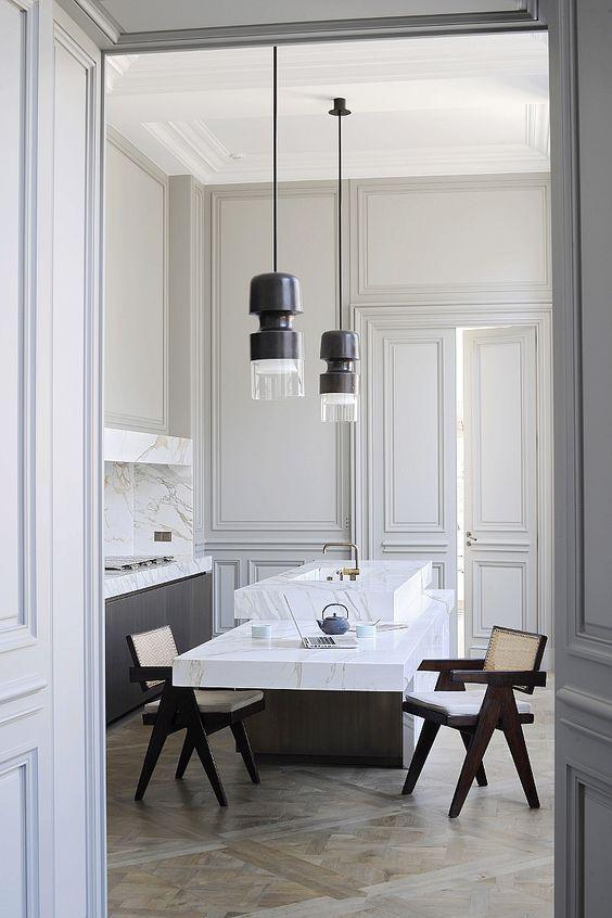 2-Encimera a altura de una silla estándar. Esto no es nuevo, pero ahora si el espacio de la cocina es amplio, siempre es más cómodo sentarse en una silla estándar con los pies en el suelo que en una alta. En la actualidad, si el espacio lo permite es una excelente solución.