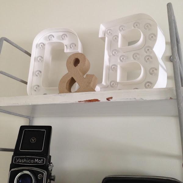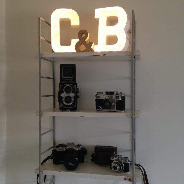Las letras con nuestras iniciales, las compramos simultáneamente a la famosa "P" de mi hermana, se iluminan mediante pilas y han sido una adquisición ideal, pues tienen el tamaño adecuado para la estrecha estantería y complementan a la perfección con nuestra mini-colección de cámaras fotográficas.