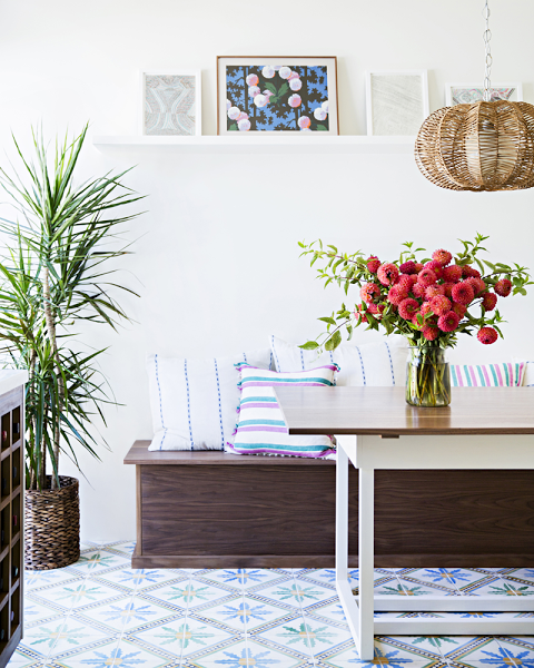 Pero lo mas llamativo de este casa situada en Los Ángeles, Estados Unidos, son los suelos con una baldosa hidráulica alegre, de colores frescos en tonos verdes, azules y amarillos, al igual que la carpintería exterior con marcos de ventanas pintados en azul y puertas amarillas.