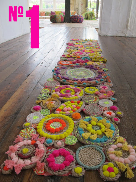 Con el Nº1 esta ALFOMBRA DE CUERDA COLORIDA que ya os traje en su momento, y que me tiene totalmente enamorada. Es espectacular ¡no me digáis que no! perfecta para instalar - por ejemplo -en un pasillo. Está totalmente fabricada en cuerda, cartón y fieltro, realizada mediante círculos de distintos tamaños unidos entre si os dejé aquí el tutorial.
