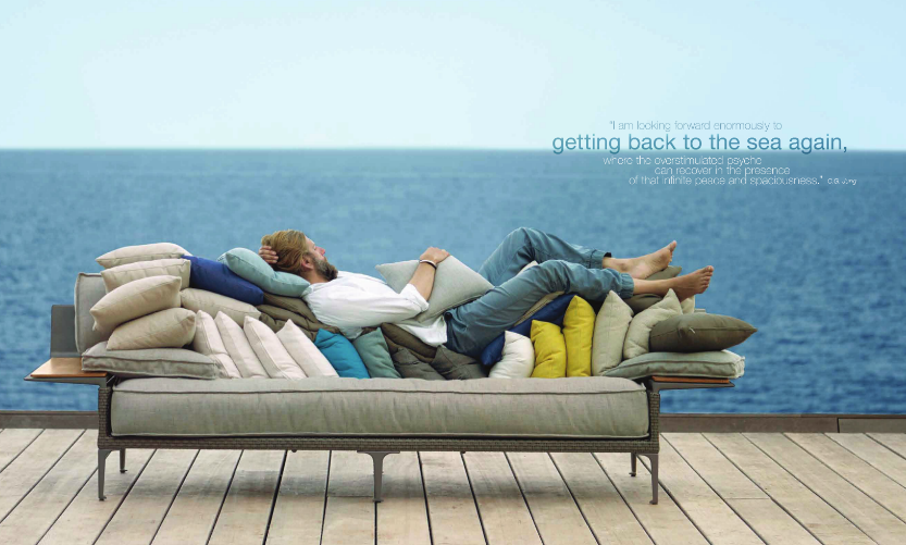 Esta sí sería una terraza privilegiada, esta imagen sacada de catálogo de Dedon nos invita a no olvidarnos de los cojines para la terraza.