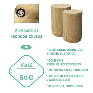 1.- Si tienes un blog y quieres participar en la fiesta de enlaces #diariodeco, tan solo tienes que seguir unos sencilllos pasos que te contamos en este enlace.....click.Además en #diariodeco14 puedes sortear en tu blog, al final del post con el que participas en la fiesta, estos regalos (a elegir por el afortunado ganador del sorteo) 2 troncos LUFE o un cheque regalo de muebles LUFE por valor de 50??? . Para ello nos tienes que anotar el nombre de tu blog y dirección de correo electrónico en el formulario que encontrarás al final de este post, para que podamos mandarte toda la información el jueves día 29 de abril.......solo tienes hoy 27 y mañana 28 de abril para apuntarte.