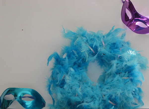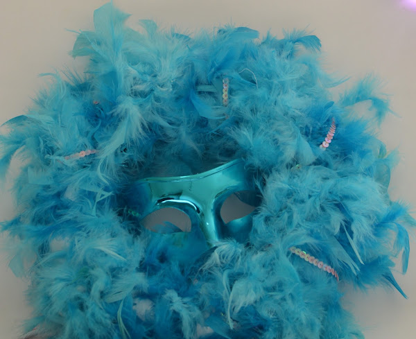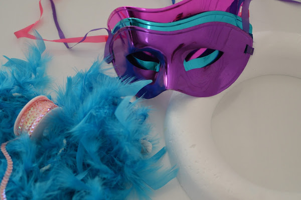 Para ello necesitaremos una base de poliespan, dos o tres boas de plumas (dependerá del tamaño de la base), lentejuelas y una máscara. El paso a paso, como nos gusta....muy sencillo:
