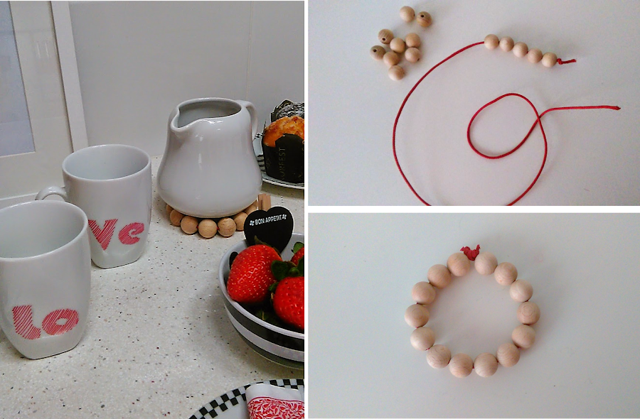Primero realicé un diy sencillísimo que yá os mostré en mi blog un salvamanteles con bolas de madera. Tan solo necesitas unas bolas de madera, las mías la he comprado en F de fifí que venden materiales para manualidades fantásticos a buen precio, y una cuerda semirígida.