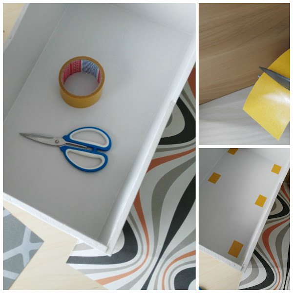 Por supuesto, debemos esperar que la pintura seque bien y cuando esté completamente seca, es el momento de darle el "toque original", además de un toque de color, que en este caso se consigue colocando un papel pintado en el fondo. Hacerlo es tan fácil como medir el fondo del cubo-estante, recortar el papel pintado a esa medida, y pegarlo en ese fondo ayudándonos de cinta adhesiva de doble cara.