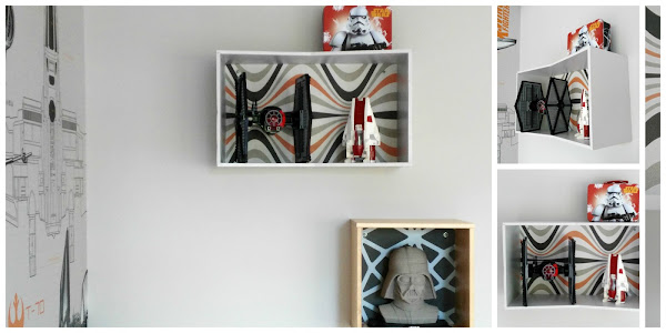 Y aquí es donde llega ese momento en el que os cuento que, como me suele ocurrir, empecé este DIY con una idea y finalmente ésta se transformó un poco. En este caso, la idea inicial era colocar un sólo cubo-estante en la pared - que es el que he preparado con la multi-herramienta de Ryobi - para que fuera una especie de escenario donde las naves de Star Wars de mi hijo pudieran lucir en todo su esplendor, pero al colocarlo en la pared caí en la cuenta de que se quedaba un poco solo en esa pared tan grande, así que decidí preparar otro más. En este caso, opté por una caja de color madera y un poco más pequeña, en la que la única intervención ha sido añadirle el fondo de papel pintado en un tono que contrasta con la del cubo-estante DIY que acabamos de ver.