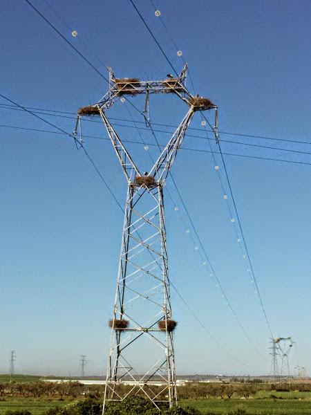 Sorprendida del espacio donde las Cigüeñas han creado sus nidos. Siempre las había visto en los campanarios de las Iglesias, pero no en las torres de alta tensión.