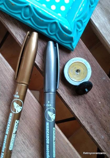 El tapón de plástico fue pintado con rotuladores en dorado y plateado. Y un botón negro forrado nos sirvió de guinda del pastel.