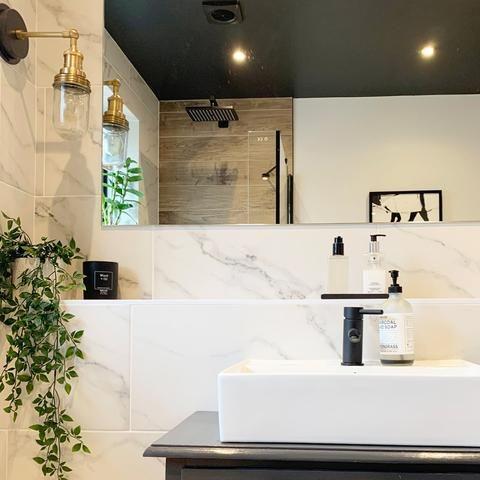 Todo el techo estará pintado en color basalto y dispondrá de una iluminación perimetral de ambiente y luces empotradas, para generar esa sensación de relax. Las paredes que no sean de madera, irán revestidas en mármol blanco veteado, y el suelo será radiante y de pizarra.