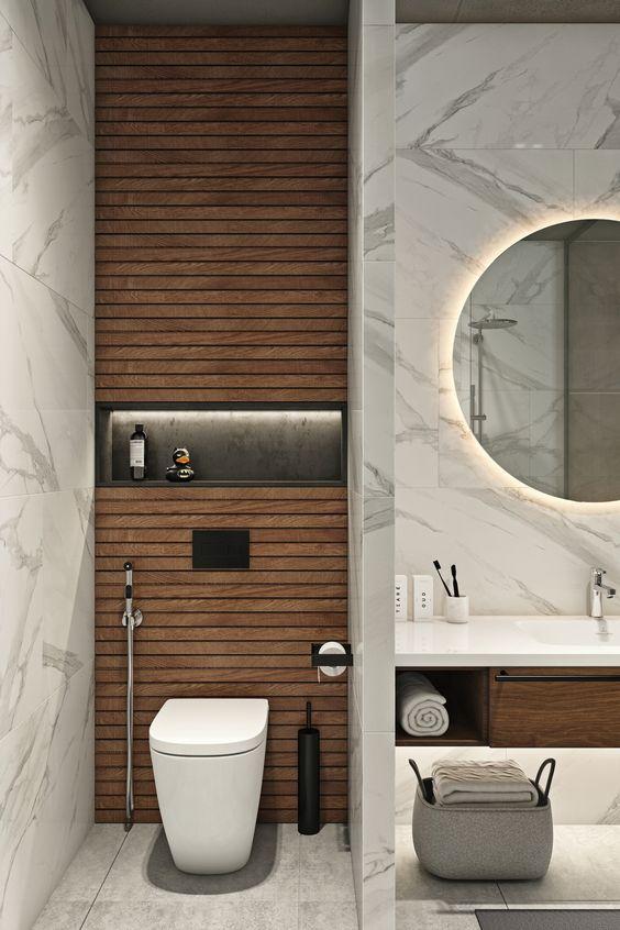 El inodoro modelo in-wash de Roca, hace también la función de bidet. Para esta zona, se realizará un cerramiento de madera, similar al de la ducha, para mantener la misma estética en todo el baño. La parte superior de la pared donde irá el inodoro, también se revestirá de madera y dispondrá de una hornacina y compartimentos ocultos para almacenar el papel higiénico y otros enseres. El marco de la ventana irá en negro, la pared en mármol blanco veteado y el suelo de pizarra.