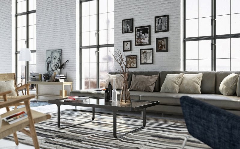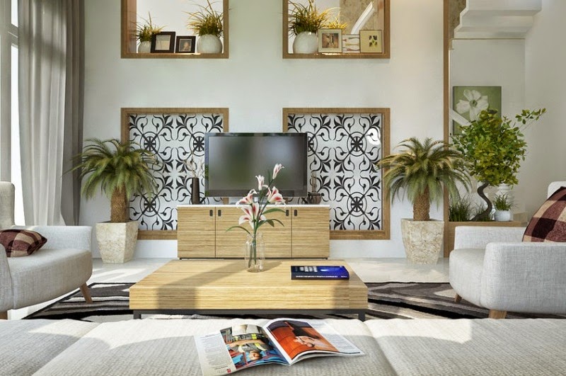Este diseño de la sala principal abierta tiene numerosas texturas dentro del espacio de la alfombra, las ramas de los árboles y los tabiques de ladrillo pintados. Las pinturas proporcionan la estética, y el mobiliario no es una sombra a juego, sin embargo, los numerosos colores trabajan colectivamente en el diseño.