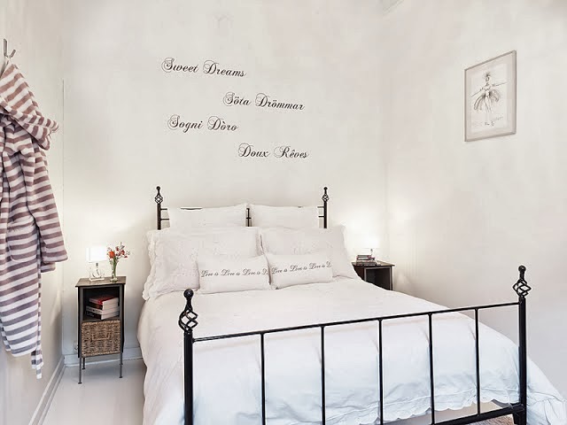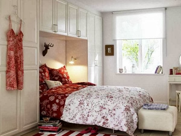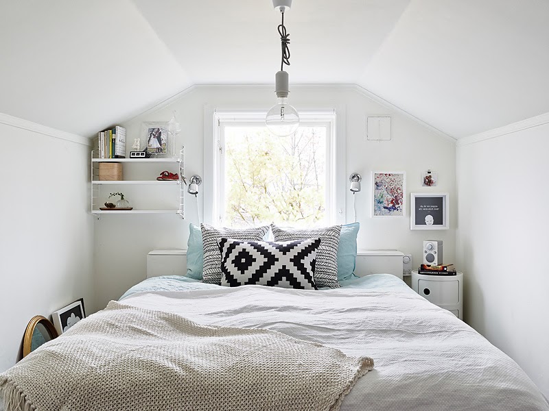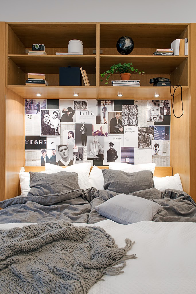 En ocasiones los dormitorios son tan escasos de dimensiones que no podremos ubicar ni una mesilla, por lo cual una buena solución será aprovechar la zona del cabecero para colocar baldas y armarios.