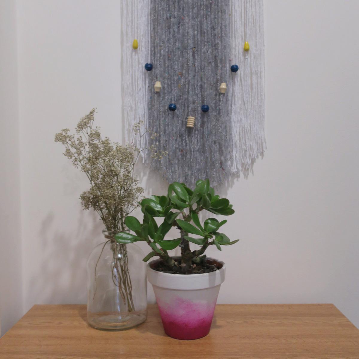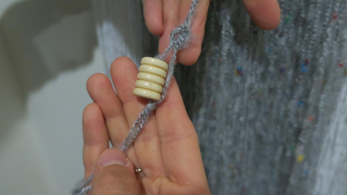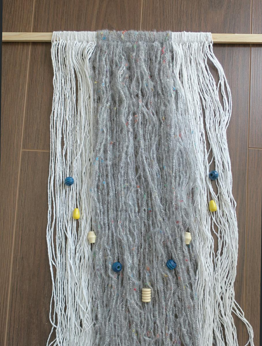 Una vez tengas todas las lanas colgadas, si quieres decorarlo con cuentas, prueba diferentes posiciones para decidir dónde las quieres colgar poniendo todo en horizontal. Puedes sacarle una foto cuando hayas decidido dónde va cada cuenta para que no se te olvide.