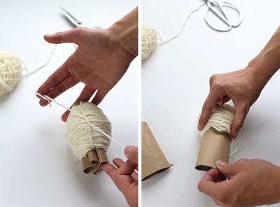 Cuando hayamos terminado el pompón, pasamos otro trozo de lana por el medio de los tubos. Apretamos bien y hacemos un nudo fuerte.