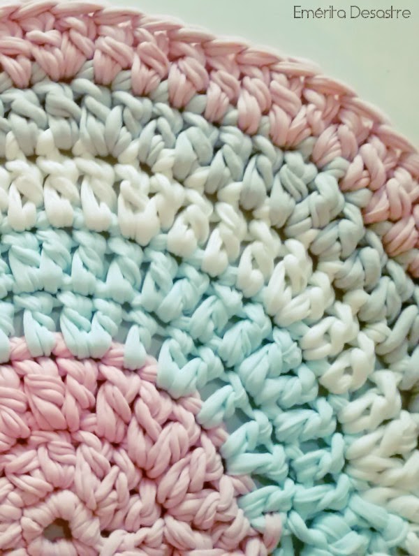La alfombra en su tamaño original que tiene más de 140 cm de diámetro. Plancharla bien para que quede redondita porque si el trapillo es de diferente grosor os puede salir un poco encogida, según veo en las fotos, creo que habrá que darle otro planchado.