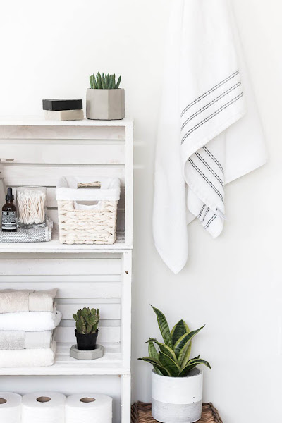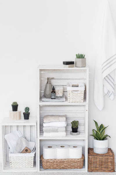Este tipo de estanterías son muy sencillas de hacer y las posibilidades son infinitas. Además con alguna planta hacen que el baño no sea tan frío y tenga más vida.