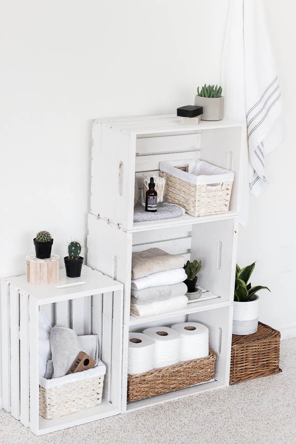 Con unas simples cajas de fruta pintadas con chalk paint han creado una estantería para el baño. Un almacenamiento extra que siempre viene bien, para poner los rollos de papel, algún frasco, los cosméticos o las toallas.