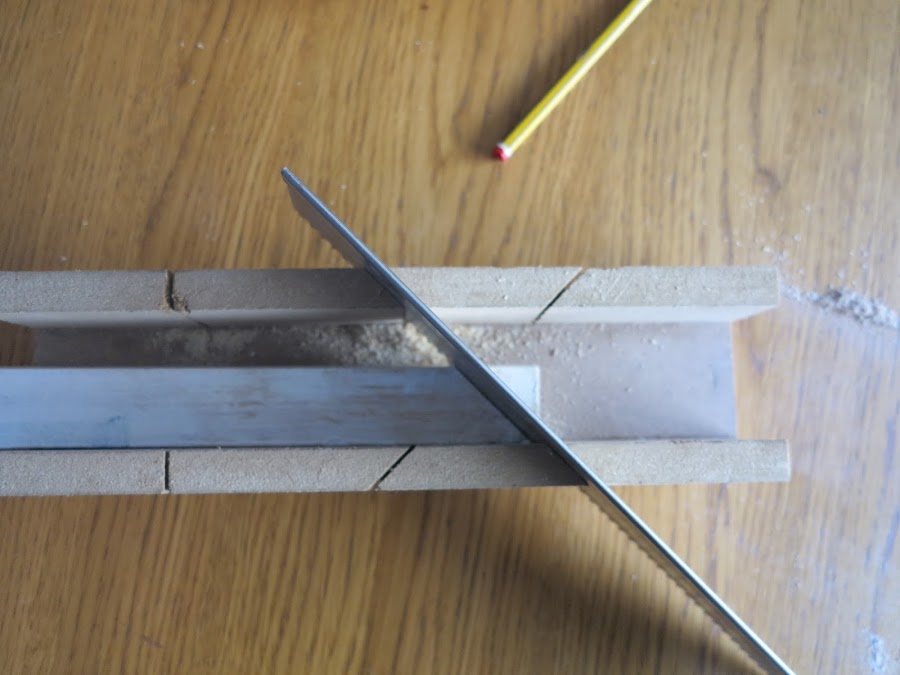 Yo lo corte con una caja y un serrucho porque al ser el listón tan finito así me aseguraba de que las esquinas, que tienen que estar cortadas en diagonal hacia arriba, estuviesen rectas.