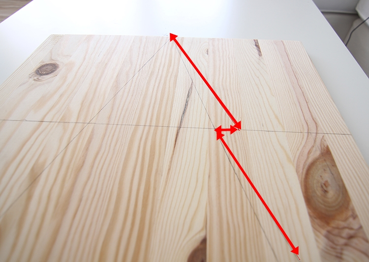 Una vez tengamos las líneas, vamos a dividir la madera en tres partes, cada parte mide 23,3cm de alto. En la parte superior marcaremos a 25cm que será la mitad de nuestra madera, y después uniremos ese punto del medio con los extremos inferiores de la primera partición. Como véis os lo he marcado de diferentes colores para que os sea mas fácil.
