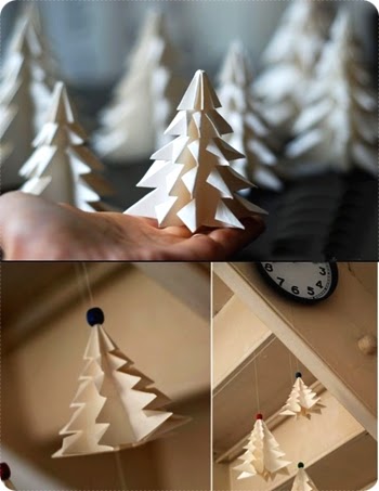 Necesitaríamos: cartulinas, tijeras, lana, pegamento, algunos objetos de decoración navideños que tenemos de otros años (todos tenemos una caja, verdad?), pegamento y .. paciencia! Este primero es un árbol 3D que se realiza con una técnica de papiroflexia, que puedes ver aquí. Puedes hacer varios de diferentes colores y colgarlos por tu casa.