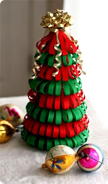 Este otro es un árbol de cintas de colores, hay que cortar varias cintas (también se podría hacer con papel de revistas y después espolvorear sobre él pintura en spray) e ir colocándolas línea por línea, de abajo a arriba. Tutorial: aquí