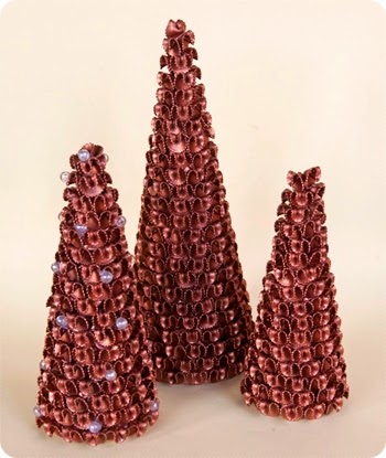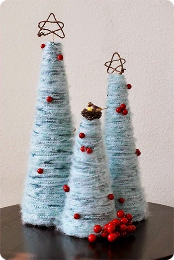 Estos árboles de lana quedan muy chulos, necesitamos conos de varios tamaños (se pueden hacer de cartulina), lana y abalorios para colocar sobre el árbol. Para verlo en detalle, clic aquí. En ésta página puedes encontrar más tipos de árbol y un vídeo con el paso a paso.