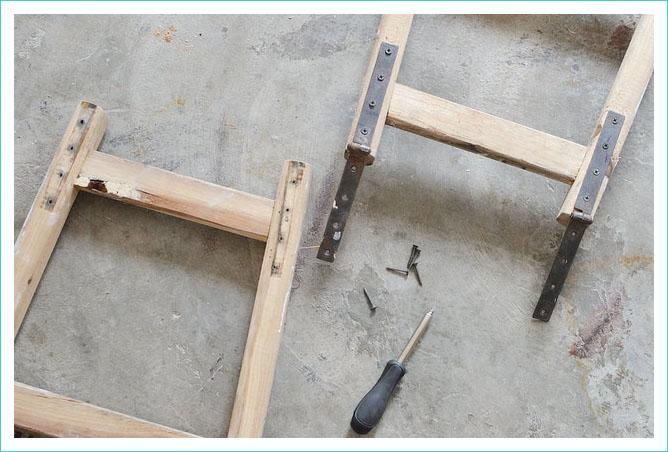 2. Colocar los soportes en forma de horquilla en el centro de la parte superior de los dos lados de la escalera. No los apretéis del todo porque habrá que colocar antes el palo redondo y necesitará un poco de holgura.