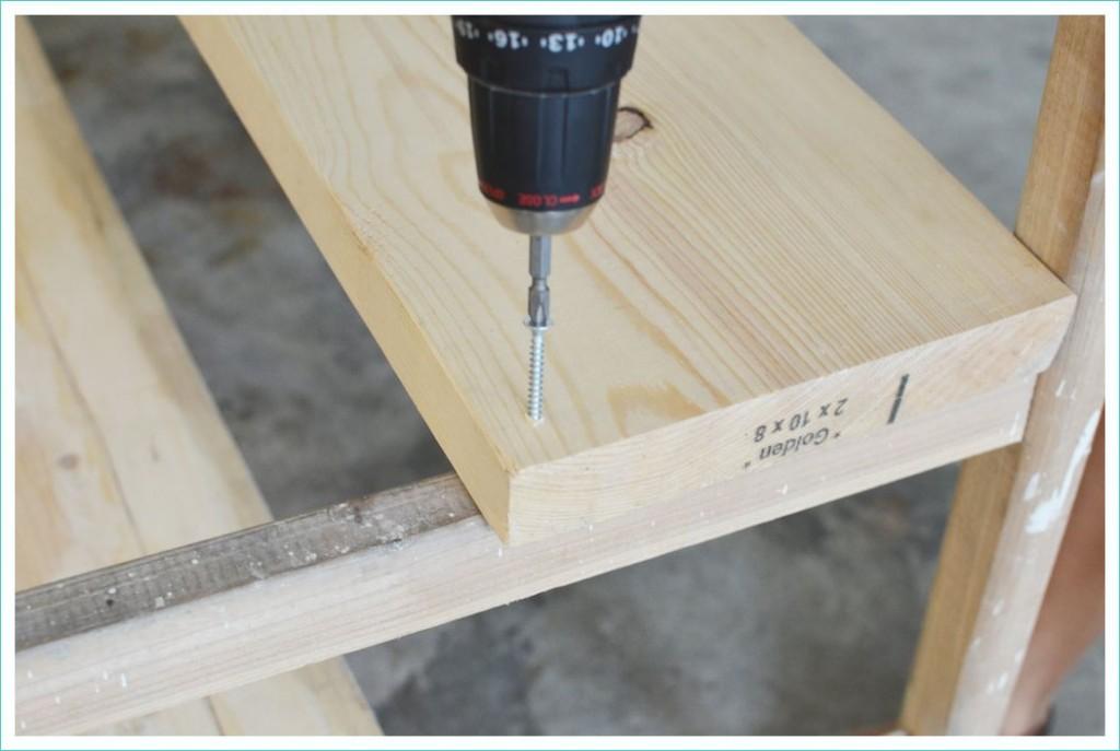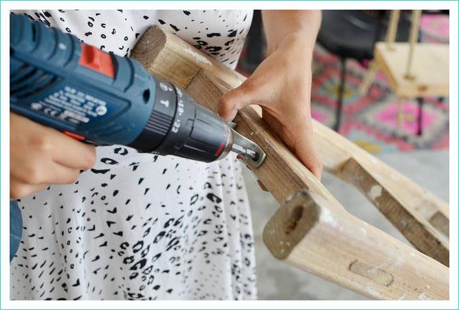 4. Una vez tengamos lista la barra para colgar la ropa, es hora de hacer hueco a zapatos, bolsos, etc. Así que tendremos que colocar las tablas de madera en los peldaños de la escalera con la ayuda del taladro y los tornillos. Calculad bien la altura donde vayáis a ponerlas y tened en cuenta la ropa que vais a colgar en la barra para que no pegue con lo que tengáis puesto abajo.