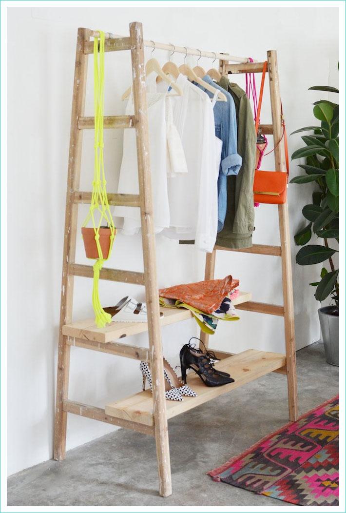 Hoy os traigo un DIY que me ha parecido genial, por lo chulo y lo práctico que resulta. Algo tan sencillo como una vieja escalera de pintor y unos tablones de madera para hacer un fantástico perchero o armario ropero perfecto para una entrada, una habitación de invitados, un cuarto de niños, un vestidor.. mil sitios donde poder colocarlo. Incluso ahora para las segundas viviendas de veraneo donde no quieres gastar mucho dinero en muebles, es una idea genial donde poder guardar la ropa y tenerla a la vista.