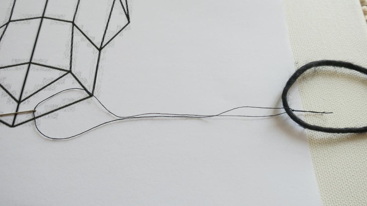Simplemente enhebra el hilo fino en la aguja y ata un nudo. Después, introduce la lana por el lazo que has creado con el hilo fino. Cuando pases la aguja por el lienzo, la lana pasará detrás del lazo, como ves en la siguiente foto.