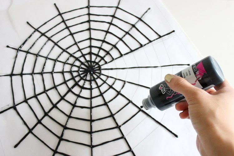 Para empezar dibujamos la tela de araña que queramos hacer sobre el papel de horno, o ponemos el papel de horno sobre la plantilla que hayamos hecho previamente. A mi me gusta mucho dibujar por ordenador, sobretodo para cosas más complicadas, pero en este caso creo que es más fácil dibujarlo a mano alzada sobre el propio papel de horno. No tiene que quedar perfecto... pero ya sabéis, a gusto del consumidor ;)