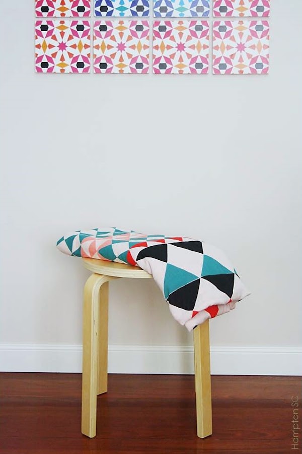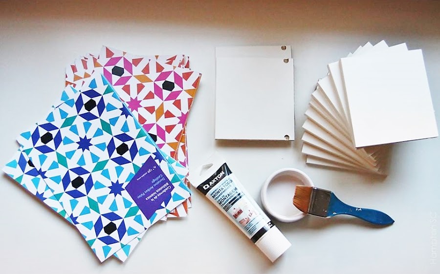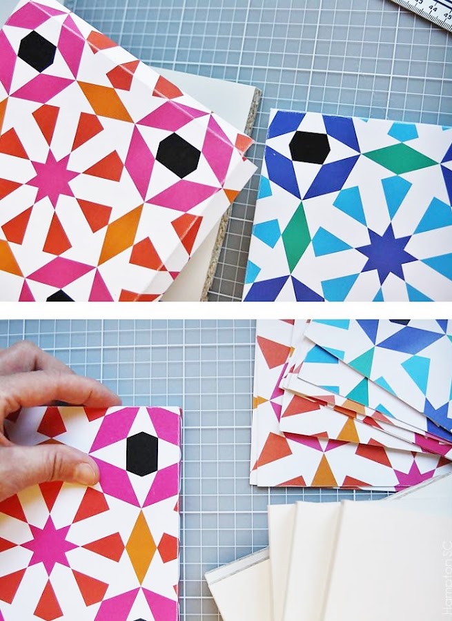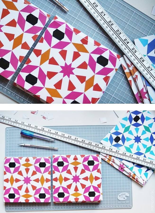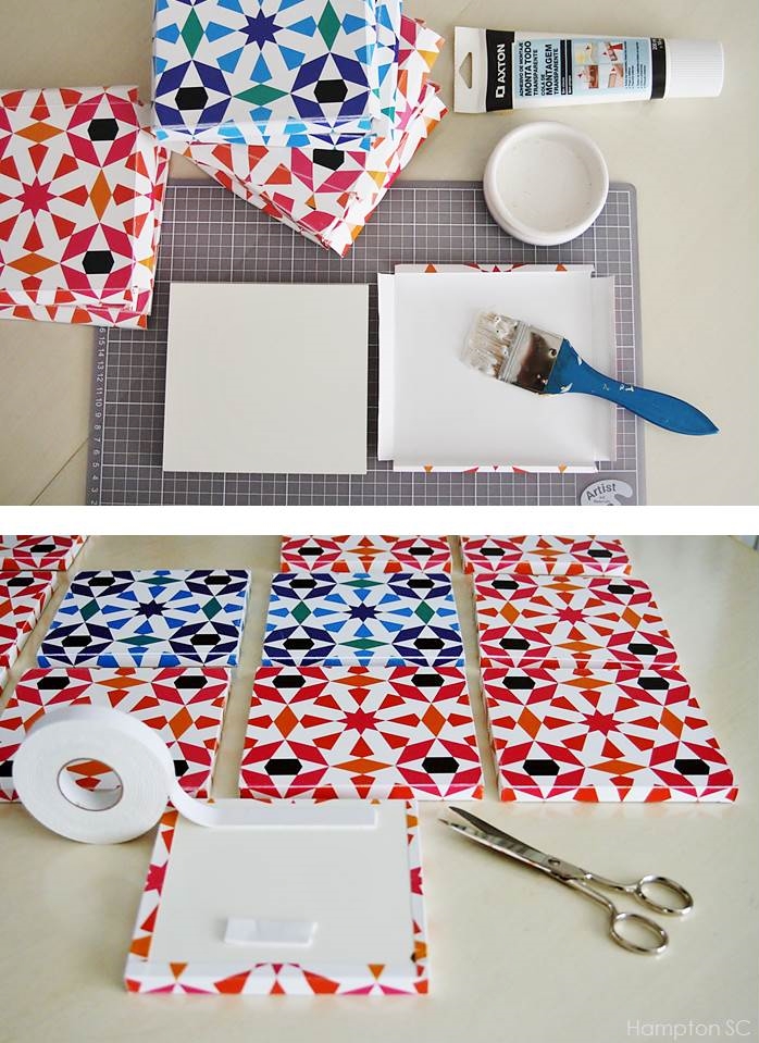 Añadí cinta adhesiva de doble cara a cada "azulejo" y formé