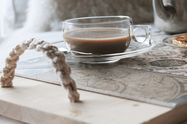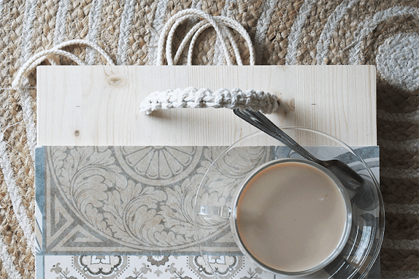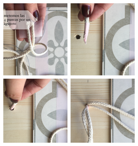 Tenerlas en el estudio siempre me viene bien para incorporarlas a proyectos pero, como os decía, alguna en gran formato me apetecía hacer algo especial con ella. Dándole vueltas y teniendo presente el tema de madera + hidráulico se me ocurrió que una bandeja quedaría genial con esos materiales. Para las asas, lo cierto es que opté por probar un nuevo nudo. Ya os he comentado que hace meses que soy adicta al macramé, así que lo de incorporarlo a todos los proyectos, se está convirtiendo en normal. Y más que feliz, oigan.