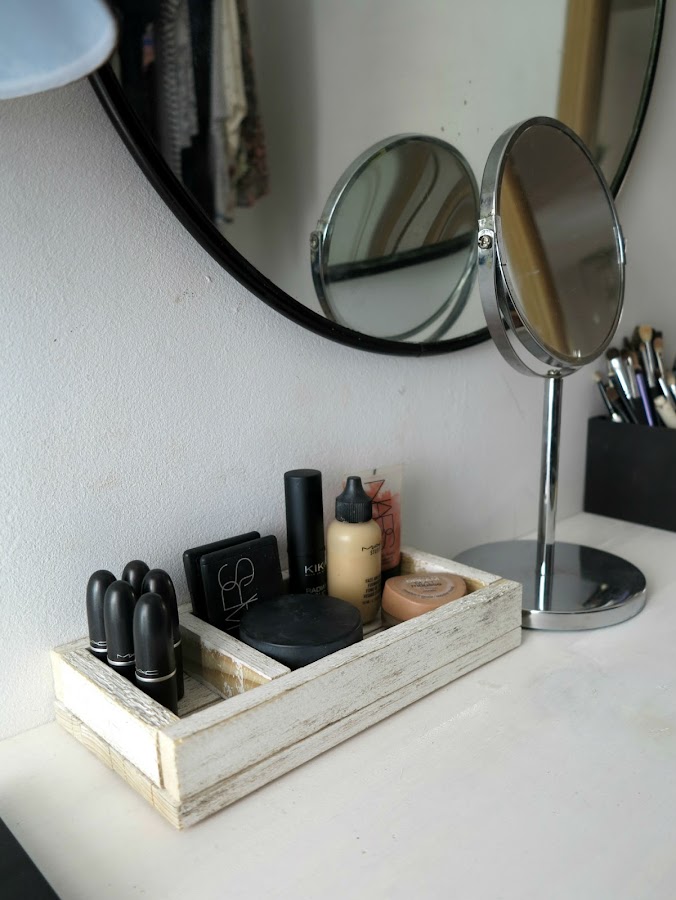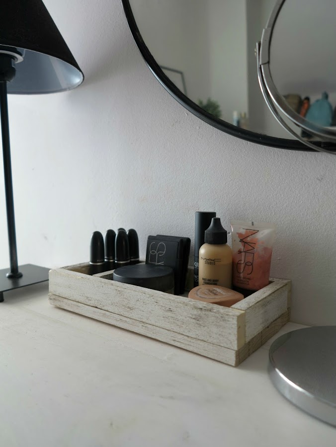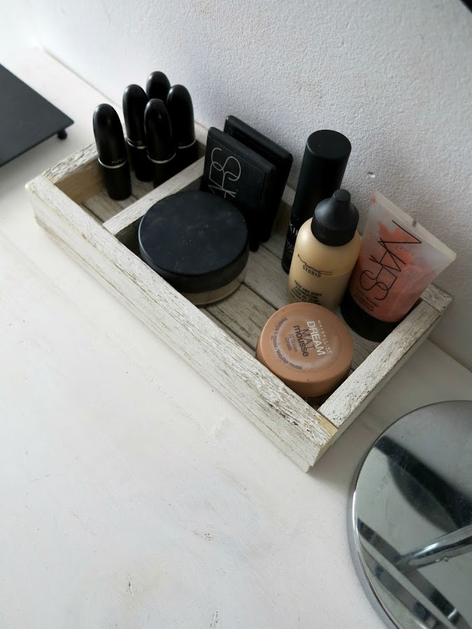 Quería tener en el tocador una pequeña bandejita para tener ahí puesto el maquillaje de diario y así tenerlo todo ordenado y organizado, ya que se trata de un espacio muy pequeño. Iba a cómprame la típica bandeja de metacrilato, pero me acorde de que tenia restos de listones de anteriores trabajos y se me ocurrió hacerla con ellos. Os enseñe el resultado por las redes y me dijisteis de publicar el paso a paso, así que aquí os lo traigo.