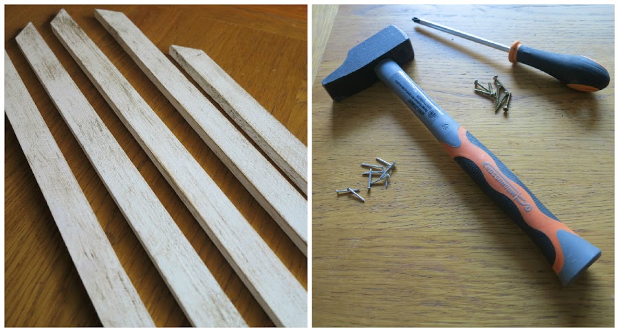 Una vez todo cortado lo lijaremos para eliminar las astillas, y lo uniremos todo por la parte inferior. De esta manera entre todos los listones se servirán de unión entre unos y otros. Si queremos podemos reforzar con cola para madera. Si decidís usar tornillos, puede que se os quebre la madera, por ser tan fina, pero no hay problema porque se pueda tapar con un poco de masilla para madera.