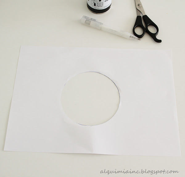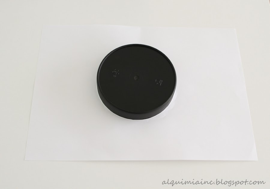 Vamos con el siguiente. Ahora cogemos el folio blanco y ponemos el tarro encima, boca arriba, y con el lápiz marcamos la base, tal y como os muestro en la foto: