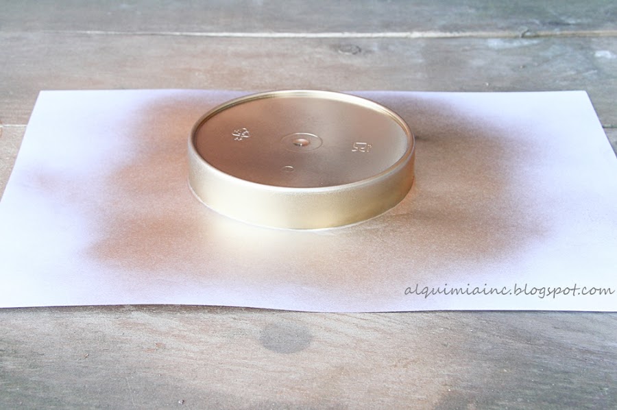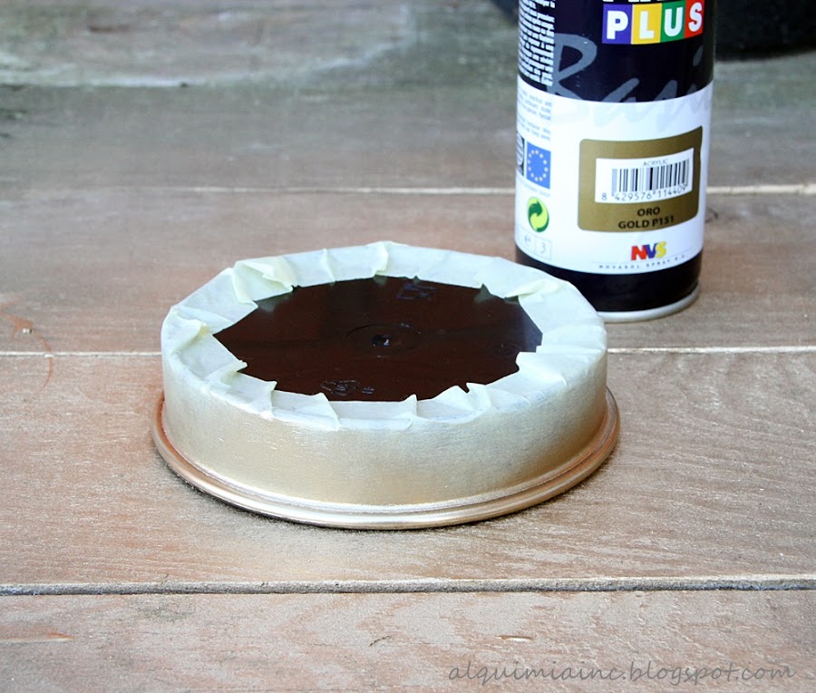 Ya tenemos el segundo tarro listo para pintar. Salimos a la terraza (en mi caso) y con el espray pintamos lo que queda descubierto del tarro, tal y como os enseño: