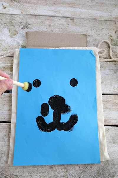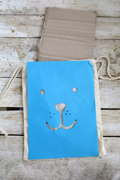 Ahora colocamos la plantilla encima, yo he cogido esta tan famosa de la cara de un perrito, he buscado en google "paper bag toy" y he copiado la imagen en un folio que he recortado por dentro, de esta manera creamos una plantilla barata y fácil.