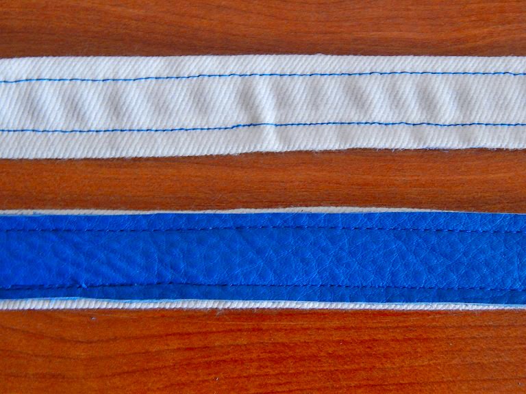 Ahora haremos las asas. Planchamos las tiras de tela con los bordes hacia adentro y las cosemos a cada una de las tiras de piel como en las fotos.