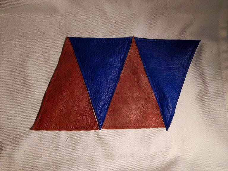 Recortamos los triángulos de piel y los colocamos en el lado exterior del otro rectángulo de tela. Los cosemos uno a uno de forma que queden lo más centrado posible y unidos entre ellos.