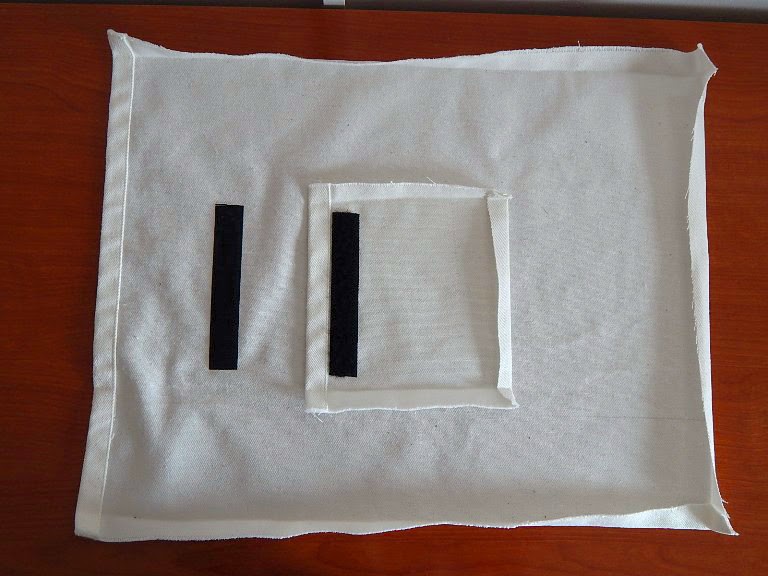 Lo primero de todo haremos el bolsillo del interior. Nos marcamos los bordes con la plancha del trozo de tela del bolsillo y le ponemos la tira de velcro (yo prefiero coserlo aunque sea de pegar para que este mejor sujeto). Pegamos y/o cosemos la otra tira de velcro en el rectángulo en el lado que será el del interior.